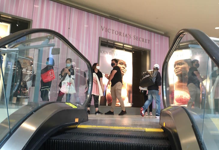 エスカレーターから下を眺めたところ。地階はチャイニーズがマッサージを行っていた気がしますが、現在はやっていません。入場者はマスク必須、店員さんももちろんマスク必須です。お店によっては、マネキンもマスクを着けていました(苦笑)。
