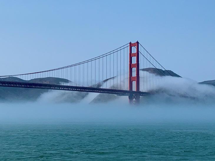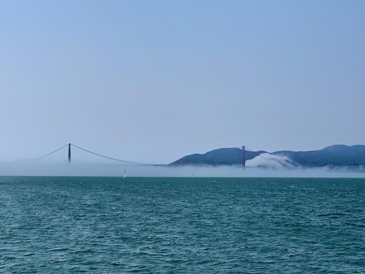 マリンヘッドランド(橋の北側)の丘にかかる霧が幻想的でした。フェリーは勢いよくゴールデンゲートブリッジに近づいていきます。海流の早い方に向かうため上下の揺れが激しくなっていきます(お父さん更に飴玉を口に放り込む)