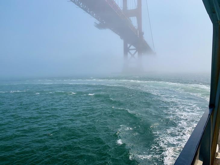 通常ゴールデンゲートブリッジ越えるとちょっとだけ停泊して、写真撮影の時間を取ってくれるんですけど、この日はスピードを少し緩めたもののそのままUターンという思わぬ行動!船が大きくカーブする面舵いっぱい的なターンでびっくり(私がオーマイゴット)