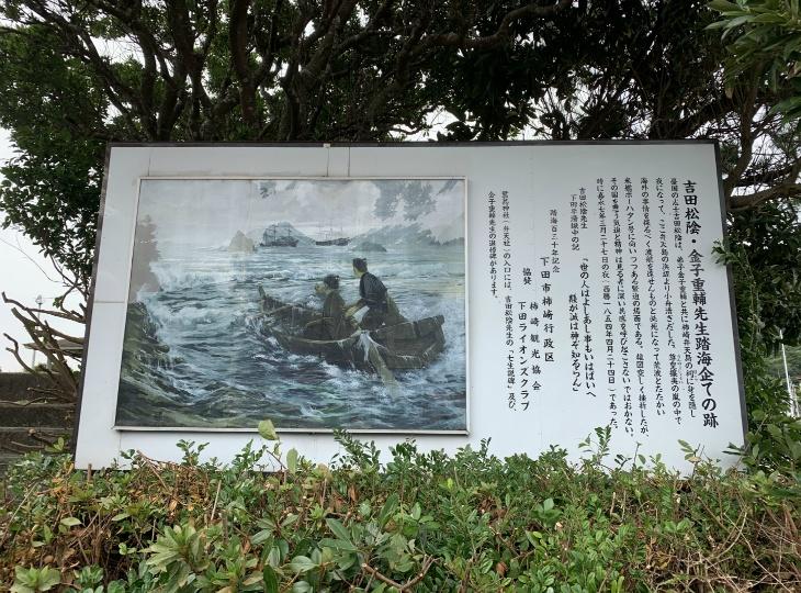 公園の入口には、下田踏海の絵があり、嵐の夜に小船を漕ぎ出す様子が描かれています。