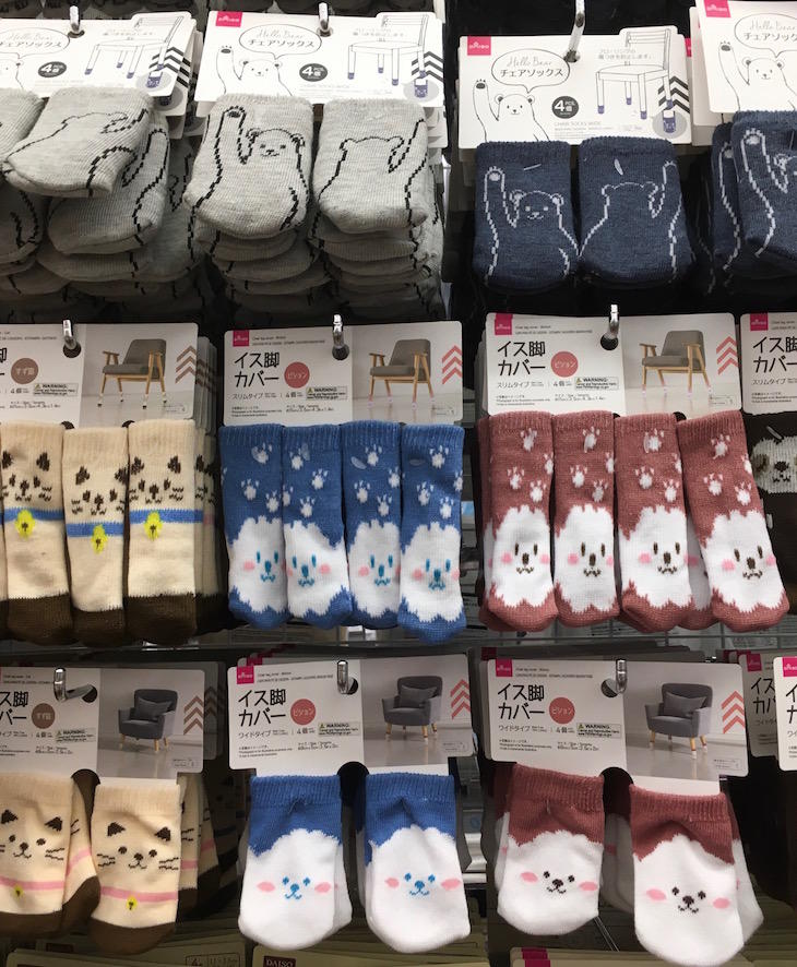 椅子脚カバーも日本ならではの感覚。くまちゃんやニャンコの椅子脚ソックス! 床が傷まないように、騒音防止のためって、理解できるアメリカ人っているんだろうか。「所詮、モノはモノ」って、使い捨て文化だからなあ。