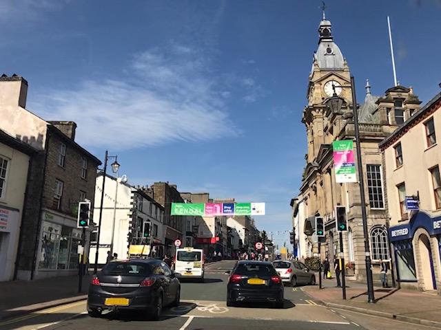 ▲ 湖水地方南部の町ケンダル/町の中心となるタウンホールとハイゲート通り