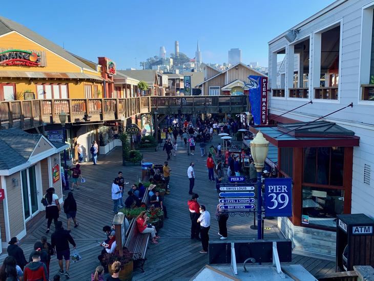 ピア39は、木造の2階建てのショッピングモールです。1977年開発が始まり、翌年50のショップと23のレストランがあったそうです。今でも残る老舗レストランは、Pier Market seafood Restaurant、Eagle Cafe、Swiss Louis Italian Seafood restaurant…コロナ禍でも何とか乗り終えてくれそうです。