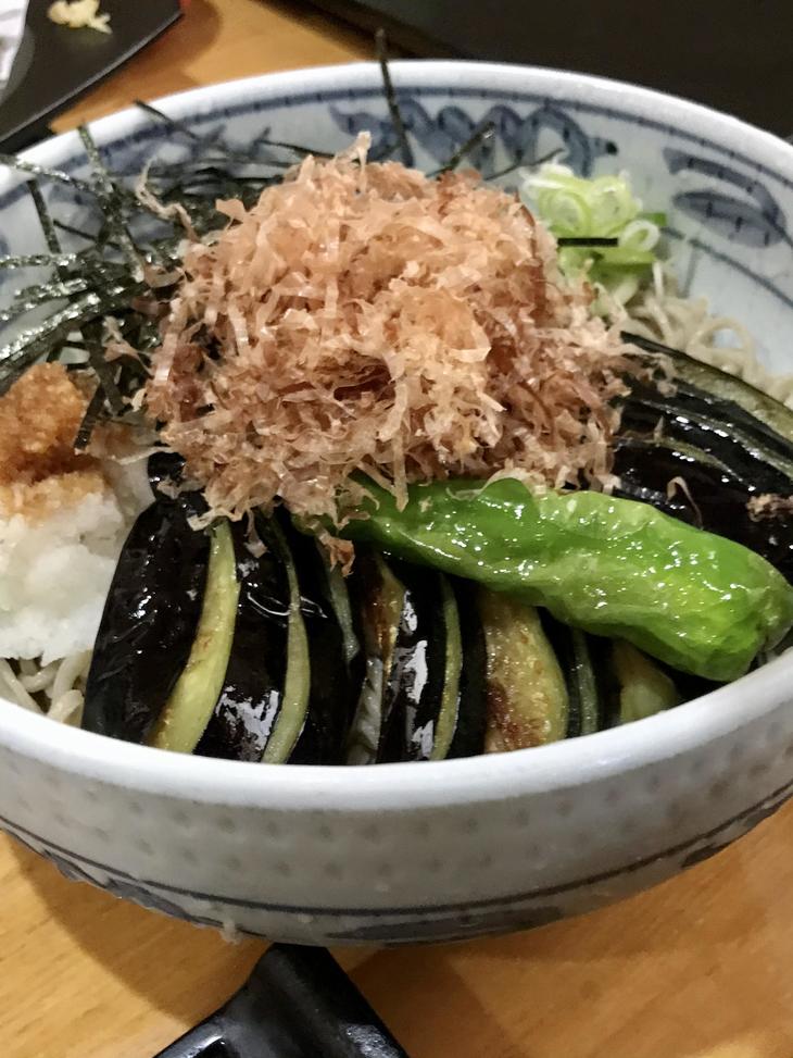揚げなすがたくさん乗って蕎麦が見えない〜