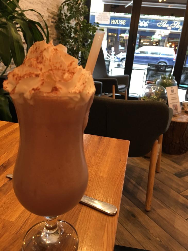 私はチャイラテを頼みましたが、出てくるのが一番遅いなと思ったらかなり本格的な、恐らく鍋でコトコト煮出したはずのすばらしいクオリティのものが登場しました。値段もリーズナブルで、看板バーガーのクリスタル・ロック・バーガーが£6.99、シシカバブセットがサラダとともに£5.99、チャイラテが£1.99とかなりのお安さです。
