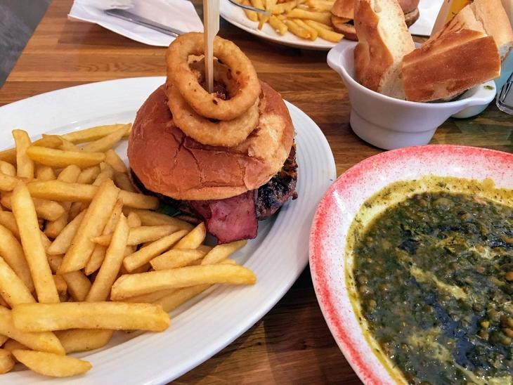 厨房には中東出身らしきコックさんが腕を奮っています。BGMも明らかに西洋ではない選曲。出てきた料理も一見普通のバーガーとフライドポテトと見せかけて、ハンバーグとベーコンのほかに、さらにタンドリーチキンまでもが挟まれていました。ソースもサルサソースで、全然「普通じゃない」おいしさとボリュームでした。