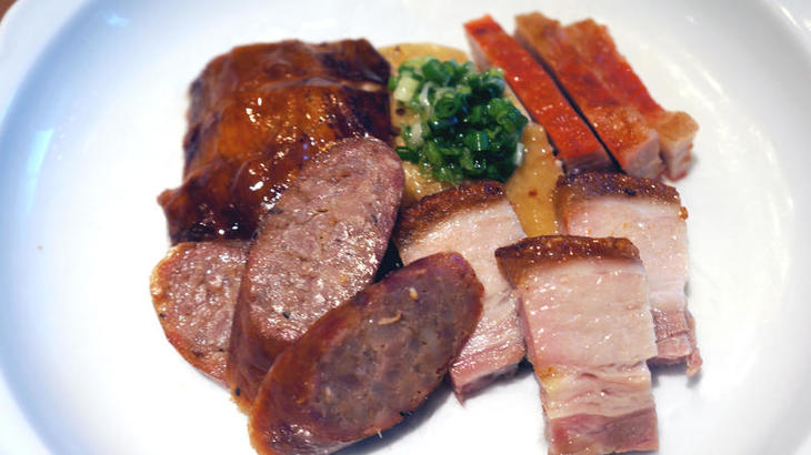 焼味とは肉類に下味をつけてそれをあぶり焼きにしたもので、代表的なのはチャーシューがあります。香港の肉の店やレストランに行くと店の入口などにローストされた肉がぶら下がっている光景を見かけます。同店の座席数は20とこぢんまりとしていますが、店内は香港そのものです。「場所柄ビジネスマンが多いのですが、それ以外でも香港人や中華系の人が多いですね」と話すのは料理人の根津光信さん。根津さんは幼少期に香港やマカオに長年在住していたので広東語が流暢で赤坂璃宮の焼物師であった梁偉康さんと一緒に店を切り盛りしています。