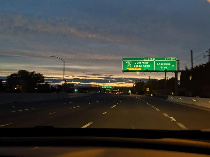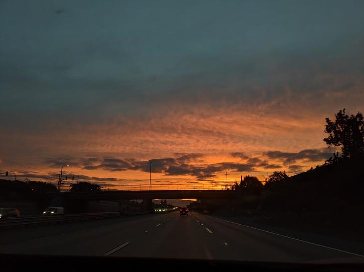 お目当てのドーナツ2ダースを無事に入手した帰路、筆者の旦那様が運転手をしてくれたので、筆者は助手席でまったりと美しい朝明けの景色を楽しむことができました。皆さんにもそのカリフォルニアの朝の眺めをおすそ分けします。