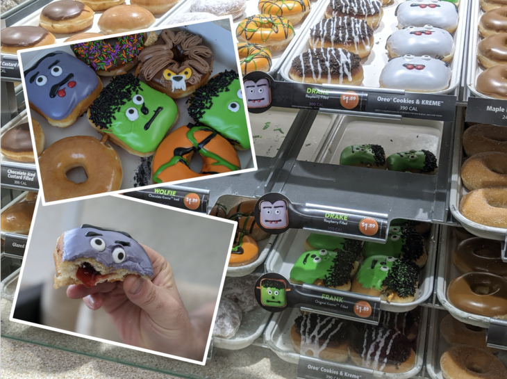 ・Frank:緑のアイシングの顔にシュガーピースの目、黒のスプリンクルの髪、プレッツェルのボルトで古典的なフランケンシュタインを再現したドーナツ。中にはOriginal Kreme™(オリジナルクリーム)が詰まっています。(筆者はオリジナルクリームをまだいただいたことがないのでどんなクリームかはどうぞご自身で見つけてください♥)
