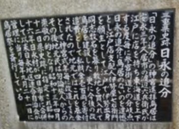 江戸時代、江戸に店を持つ当地出身の方が東海道を行き来するなか、参宮街道との分岐点にである日永の追分に鳥居がないことを遺憾に思い、尽力をつくして寄付を集め、この地に鳥居を建立された模様やその後が記載されています。