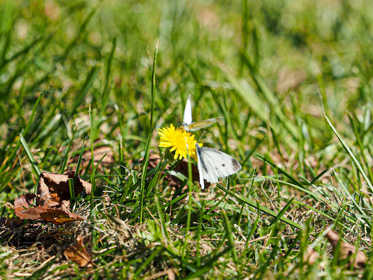 蝶は、ぽつぽつと咲いている数少ないタンポポをめがけて2匹が同じルートで飛び回っていました。