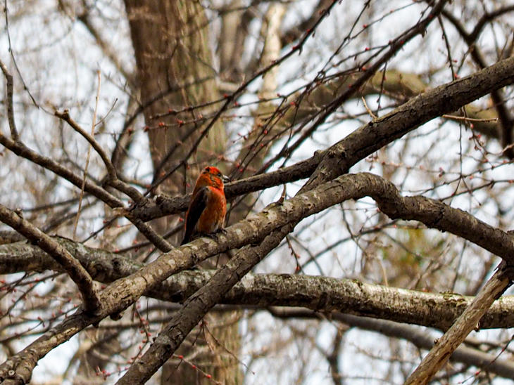 ちなみに、こちら↑が「ギンザンマシコ」です。割と大きめなのですが、今回は葉と枝に紛れるとなかなか見えませんでした。写真のギンザンマシコ↑は、北海道神宮でみかけたものです(3月)。