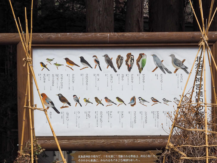 今回は前田森林公園まで足を延ばしてみましたが、札幌市内では「円山公園」や「北海道神宮」などが地下鉄東西線「円山公園駅」から近く、アクセスしやすい森がある場所で、ここでもエゾリスや野鳥を見ることができます(写真は北海道神宮境内にある「北海道神宮境内の野鳥」の案内)。また、同じく地下鉄東西線「西18丁目駅」から徒歩でアクセス可能な「北海道知事公館」と「道立近代美術館」にも大きな木があり野鳥やエゾリスを見かけることがあります。