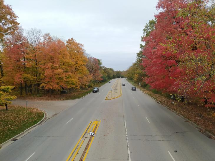 歩道橋の上から見渡す道路も紅葉の木々とマッチして普段なら何とも思わない道路がとってもすてきでした。あっ、標識がグニャリと倒れていますが(笑)