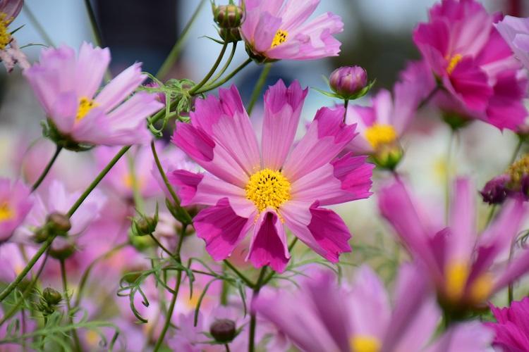 センセーションなど9種類のコスモスが植えられています。写真はシーシェルという品種です。
