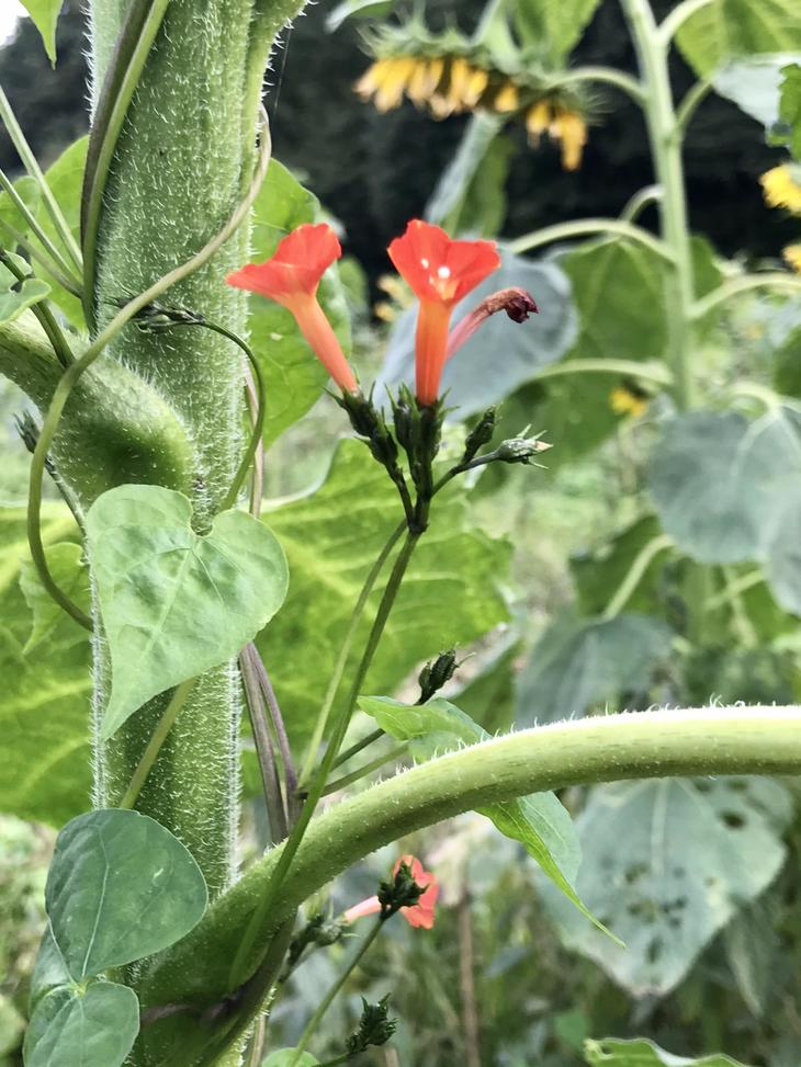 ひまわりの茎に赤い小さな花が