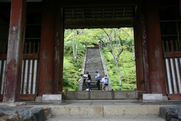 石段の両側は緑美しい苔の世界が広がっています。