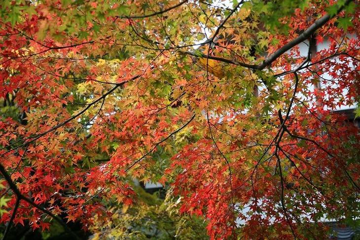 常寂光寺は小倉山の中腹に建つ寺院ですので、陽の当らないところは青もみじが多いですが、陽が多く当たるところの木々は紅葉が進んでいます。