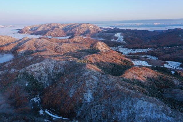 手前に館の越山。その先、雲海の下に矢ノ原湿原となります。