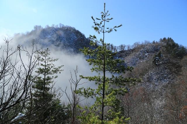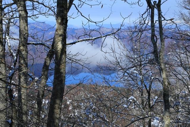 樹木の先に、ようやくガスの抜けつつある沼沢湖