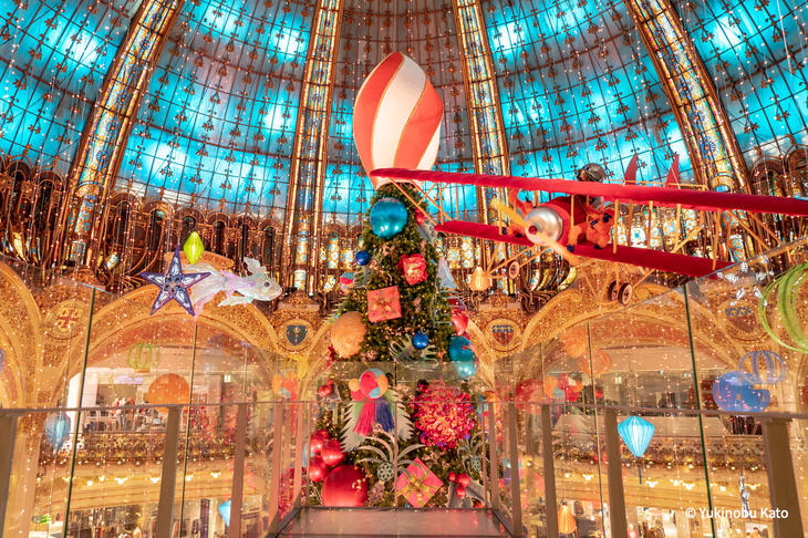 建物内のクリスマスツリーも準備ができています。本館中央に設置された恒例の巨大ツリーには、プレゼントやエキゾチックな花々や木々、猿などがデコレーションされ、周囲には魚が泳ぎます。そしてツリーの上部にはプロペラ飛行機が。フランスから異国に飛んできたかのようです。