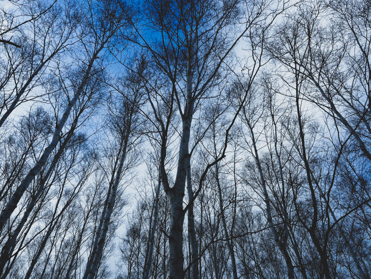 葉がすっかり落ちたシラカバが群生している場所で空を見上げると、空を背景にまっすぐ伸びた幹からパッと広がるバランスがよい枝ぶりがアート作品のように見えます。