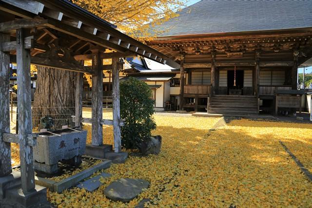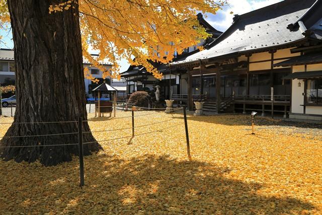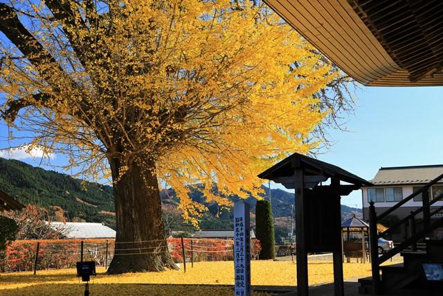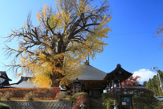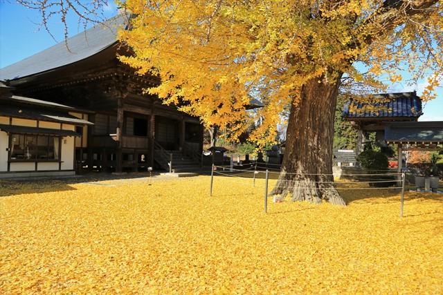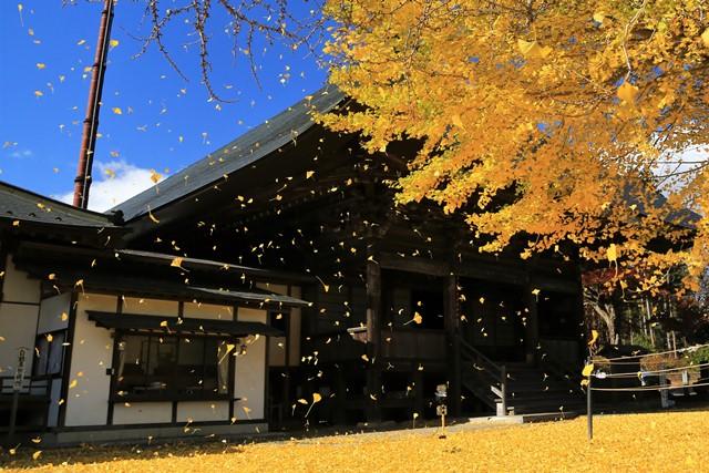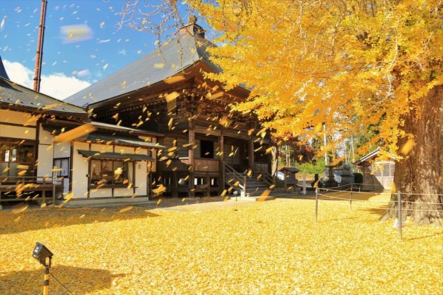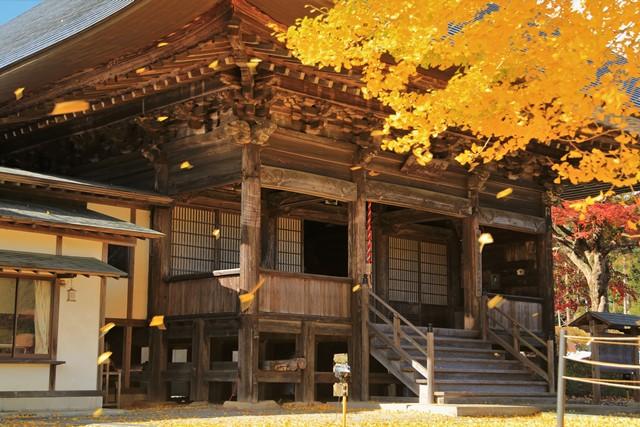 県の重要文化財でもある本堂と、境内を彩る大いちょうのコラボが美しいスポットです。