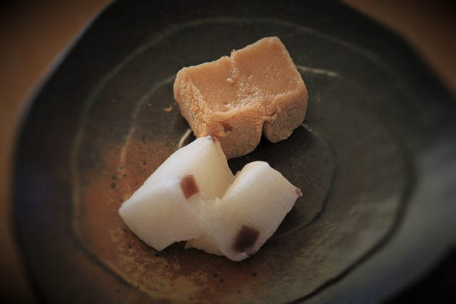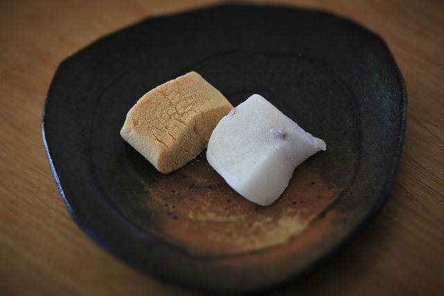 こんにゃく餅(手前)には羊羹が練り込まれており、もち米と粉こんにゃくが織りなす食感があいまって、控えめで上品な甘みが堪能できます。