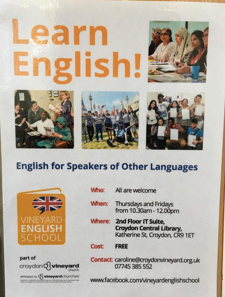 ◼️Vineyard English School・住所: Katharine Street, Croydon, CR9 1ET (クロイドン中央図書館内3階[2nd Floor]IT Suite内)・最寄駅: 電車East Croydon駅・URL: https://croydonvineyard.org.uk/43/Vineyard-English-School