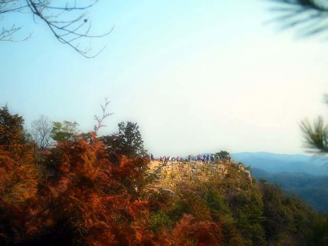 一帯は急峻な山容で岩が露出し、そびえ立つ山肌、地形に沿った城壁が一体となり、人を寄せつけず周囲ににらみを利かせているような山です。山林が削られて見える場所は、遺跡を復元しています……。