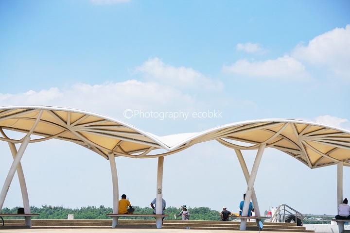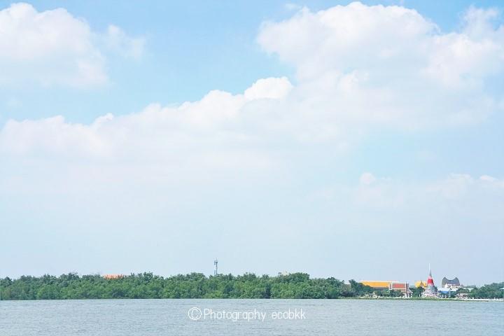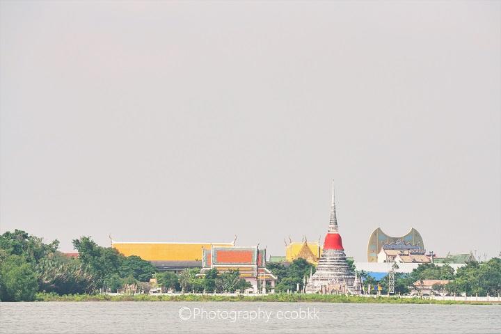 この公園から見える寺院は、サムット・プラカーン県の憲章にもなっている寺院「ワット・プラサムットチェディ」です。実際に、近くのサムットプラカーン港(船着き場)から船に乗って、対岸に渡って、寺院を観光することもできます。以前、この寺院とその近くの観光スポットを以下記事で紹介していますので、興味がありましたら、ぜひ合わせて参考にしてみてください。