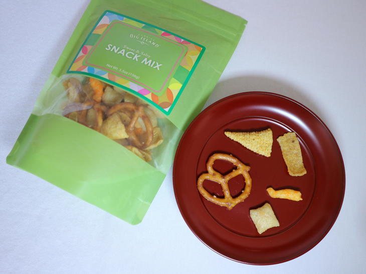 名前のとおり「甘味」と「塩味」がミックスしたスナック菓子です。中には、塩味のプレッツェル、円錐形のコーンチップ(日本だととんがりコーンかな?)、リボン型の甘めのコーンチップ、チーズ味のスナック、そして砂糖でコーティングした四角型のスナック菓子が入っています。