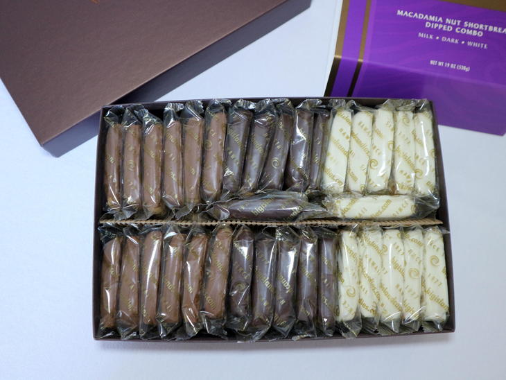 その中でも、不動の人気はミルクチョコレートとダークチョコレートとホワイトチョコレートの3種が入ったマカダミアナッツ・ショートブレッドクッキーのセットです。これだと、家族や友人と一緒に食べても十分な量があります。
