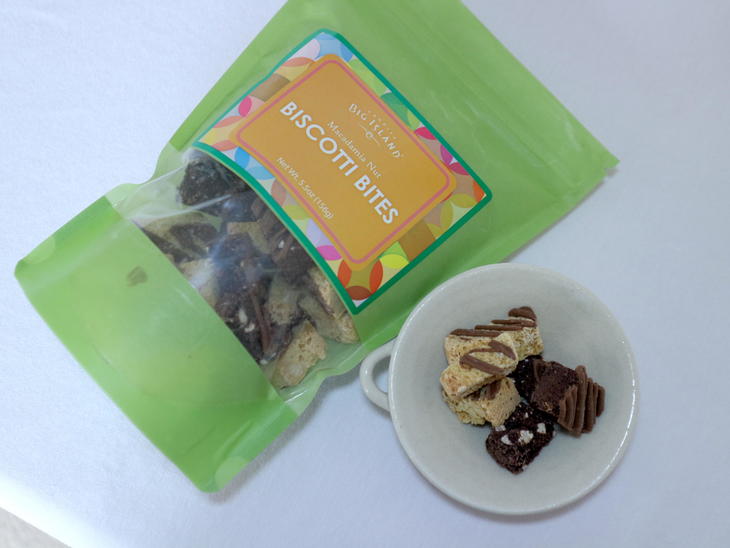 ビッグアイランド・キャンディーズのビスコッティは定評のある人気商品ですが、サイズはアメリカサイズで、ほぼ20センチ近くありそうな大きさです。今回発売となったのは、小さいひと口サイズ。イタリア語で「二度(ビス)焼きされた(コッティ)」という意味のビスコッティは、ポリポリとした少し硬めの食感が持ち味です。