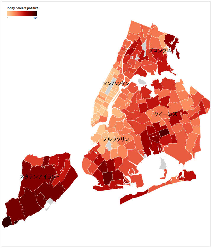 (C) New York City Gov NYCの陽性率マップ(赤くなるほど感染率が高い)