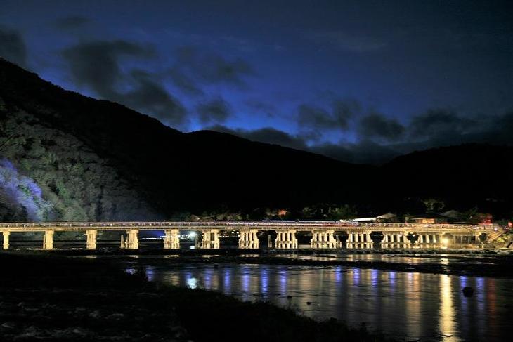 幻想的な薄紫の光に、山々と渡月橋(155m)が浮かび上がっています。