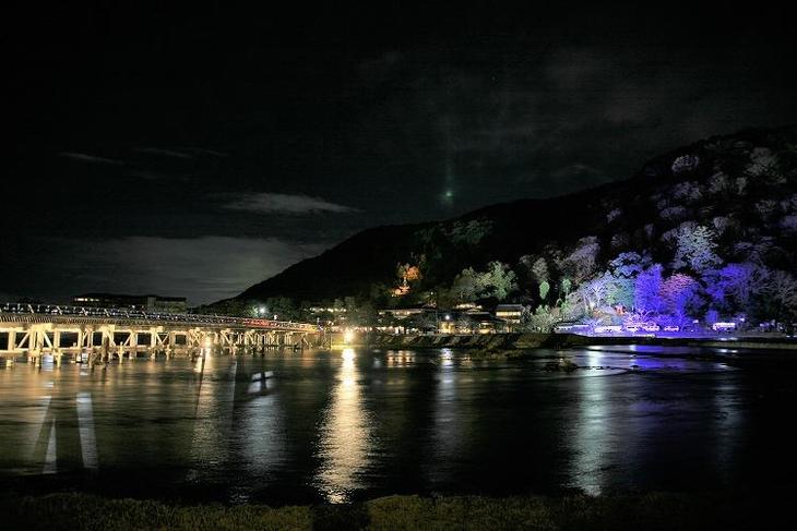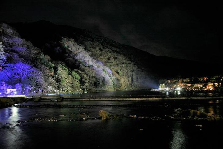 ライトアップでは、嵐山と大堰川が薄紫色に浮かび上がっています。