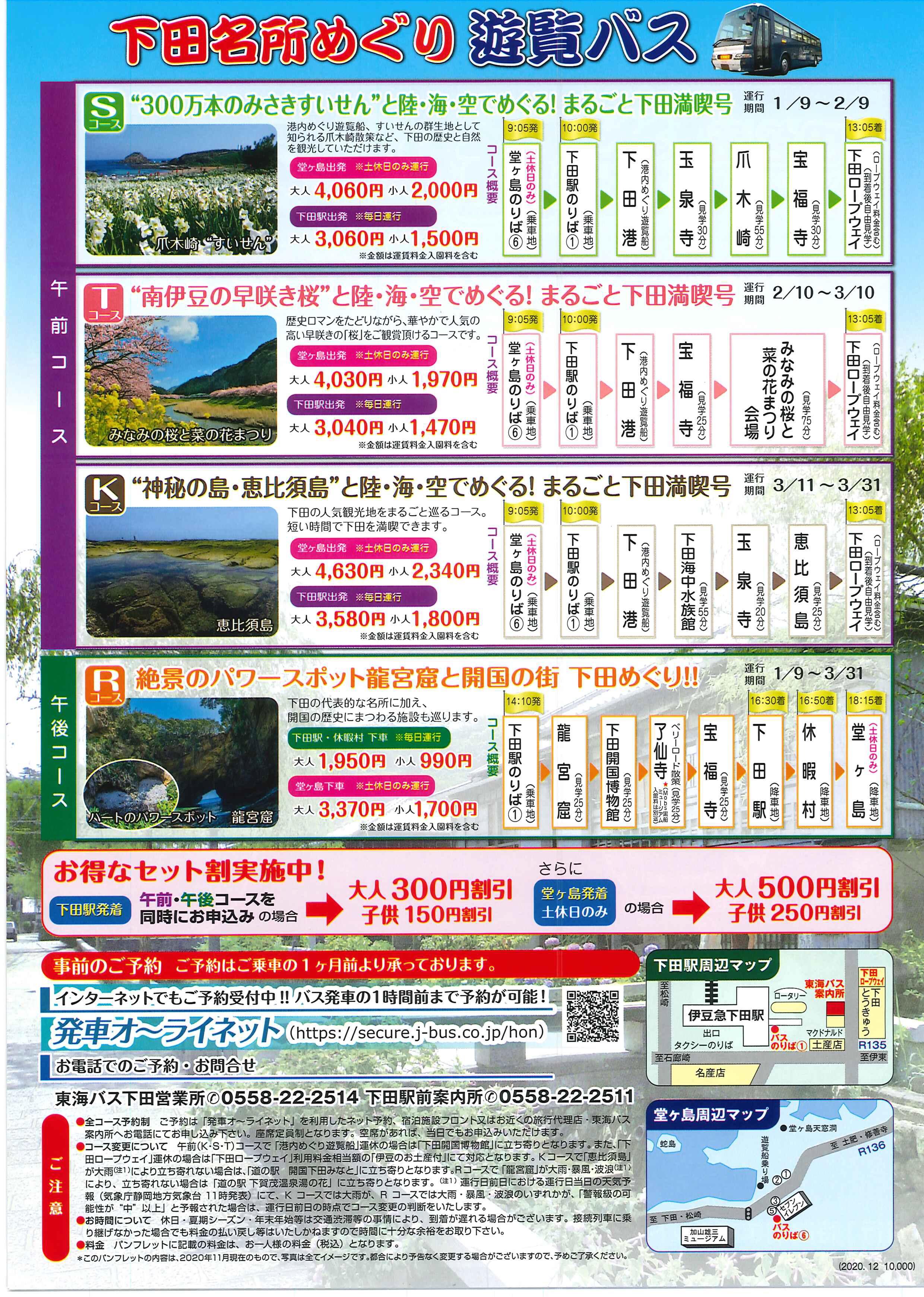 東海バスが運営している定期観光バス「下田名所めぐり遊覧バス」が2021年1月9日(土)より運行を再開します。運行再開にともないまして、12月9日(水)より予約ができます。今回より、西伊豆地区に宿泊の方にも「下田名所めぐり遊覧バス」を気軽に利用できるよう、1月9日(土)~3月28日(日)の期間、午前コースの乗車場所と午後コースの到着地に堂ヶ島を新たに設定しました。下田市にお越しの際はぜひご利用ください。