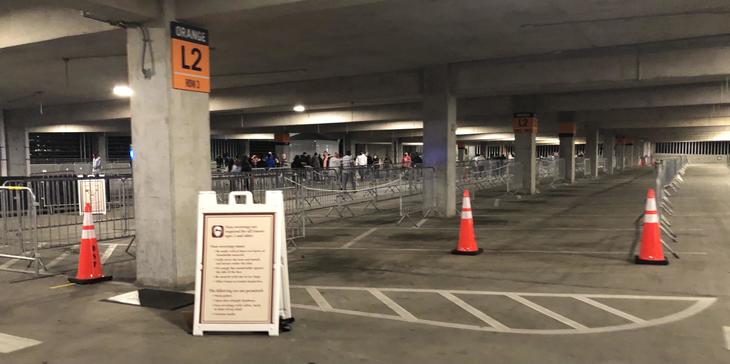 入場にはマスク着用が必要で入口も規制されていました。検温や手荷物チェックなど通常では行われない作業をしています。