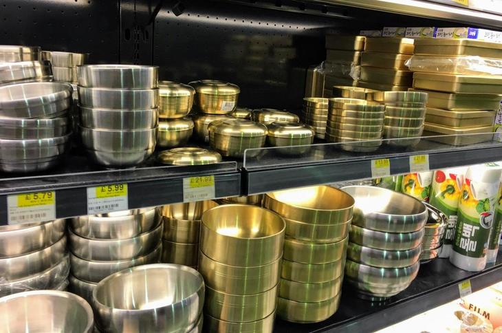 中華系ですと鍋や器などけっこうイメージがつきやすいですが、これが同じ東アジアでも韓国となるとアルミ鍋ひとつとっても見慣れず、おそらくビビンバや冷麺を入れると思われるステンレス製の器があったりと珍しいものがたくさんあります。