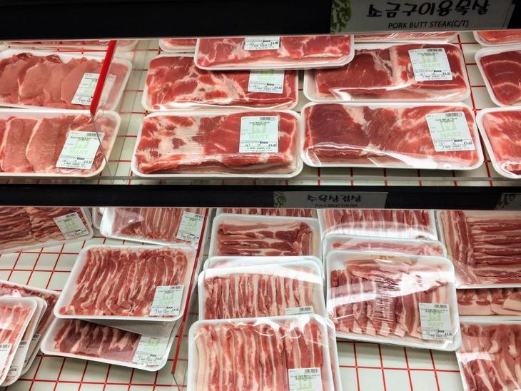 そもそもの目的は、イギリスの普通のスーパーでは絶対に手に入らない薄切り肉を求めてのこと。期待を込めて到着すると、ハングル文字が並ぶ広告看板にわが家が住むクロイドン(関連記事)ではとんと見かけない韓国人がたくさんおり、かなりの非日常感が漂っています。