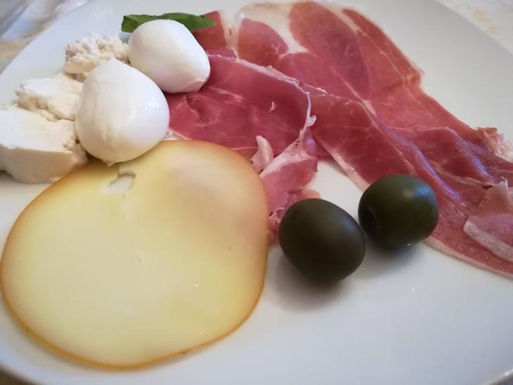 オリーブやモッツアレラチーズ、リコッタチーズやべべ、ズッキーニ・スカペーチェ、パルマ産の生ハムなどの肉系のアンテイパスト!(盛りつけは夫)