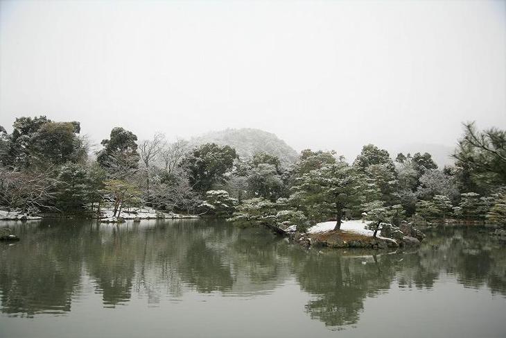 後方の衣笠の山々も、モノトーンの世界。
