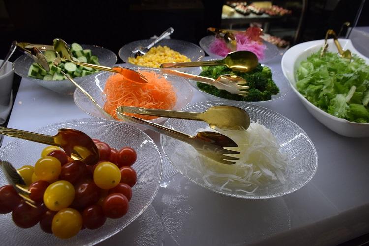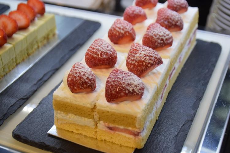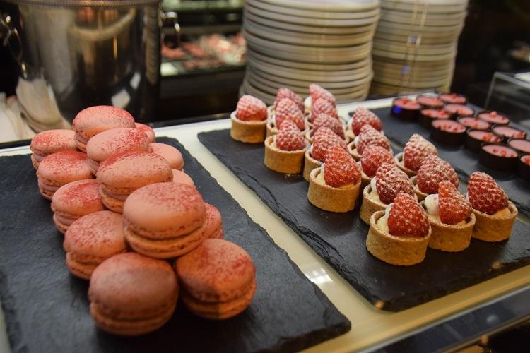 今年はウエルカムドリンクはありませんでしたが、スイーツの味のレベルは変わらずの高さです。右から2番目のケーキは、ピエール・エルメの限定スイーツ「ババロワーズあまおうピスタチオ」です。ピスタチオの緑色が美しいです。