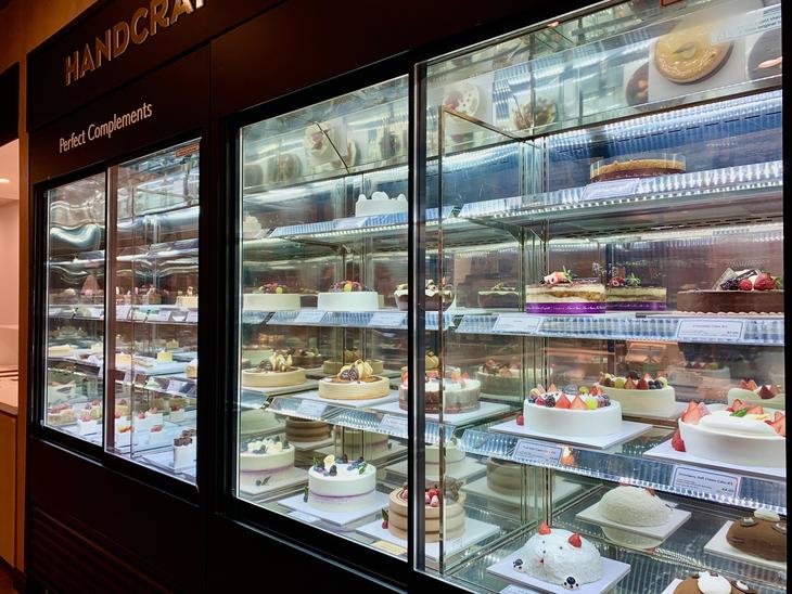 ガラスケースのショーケースのライトを少し寒色系にすることにより冷んやりと見える白いケーキのクリームが際立って見えます(ホールサイズで$40~)