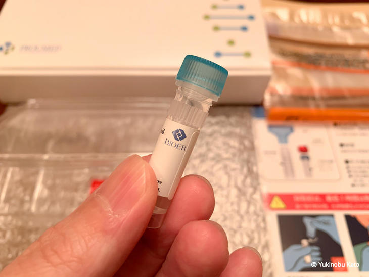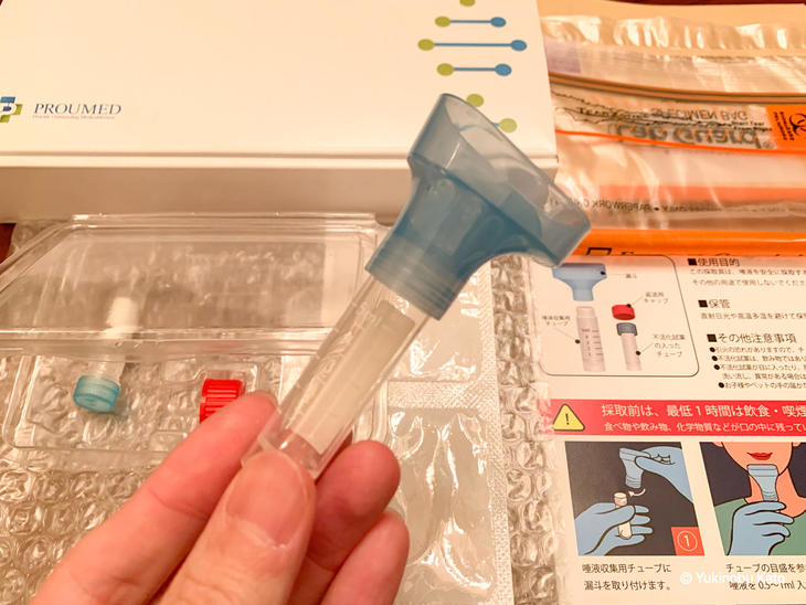 さて、出発72時間以内になりました。届いたキットを開封して検体の唾液を入れます。漏斗をプラスチックの検体容器につけ、そこに唾液を垂らしていきます。