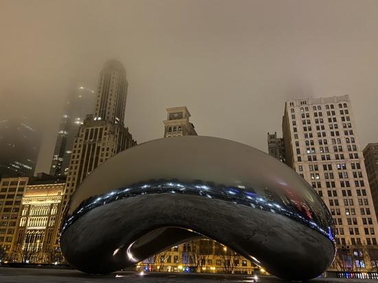 コロナ禍でなければ、このビーンズの真下にも入れますし、写真を撮ったり、触れたりもできるのですが……この夜は日中との温度差があったため、霧が出て高層ビルの上階が神秘的な装いになっていました。シカゴの高層ビル群が霧に包まれることはときどき起こり、ニュースで紹介されることが少なくありません。