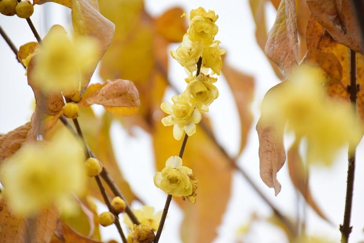 梅よりも目立っていたのが満開の蝋梅(ロウバイ)。名前に梅と入っていますが、梅の仲間ではありません。花の色や光沢が蜜蝋(みつろう)を連想させるというのが名前の由来です。甘い香りが強く、英名でWinter sweetというぐらいです。