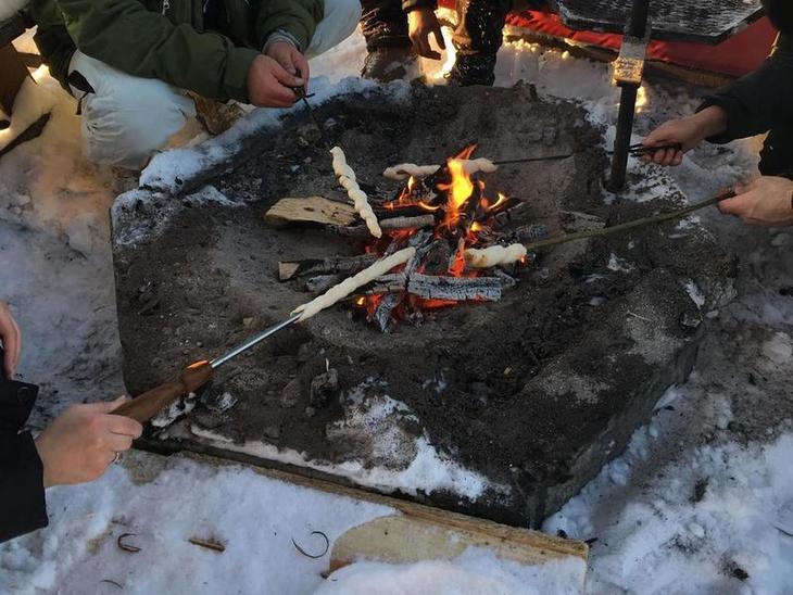写真はpinnbröd(ピンブレード)といって、スウェーデン語で「枝」を意味するpinne(ピンネ)にパン生地を巻きつけてグリルした食べ物です。枝は森に落ちているものを拾います。パンが焼けたら、バターやジャムとともにいただきます。飲み物はやはりコーヒーや紅茶が欠かせません。