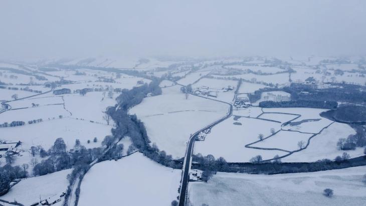 ▲ 自宅上空から撮影したカフロニズ(Cyfronydd)村周辺の雪景色